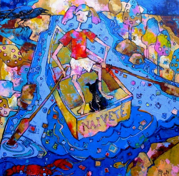 caption on edge of canvas: "Looking Backwards, Rowing Forwards"