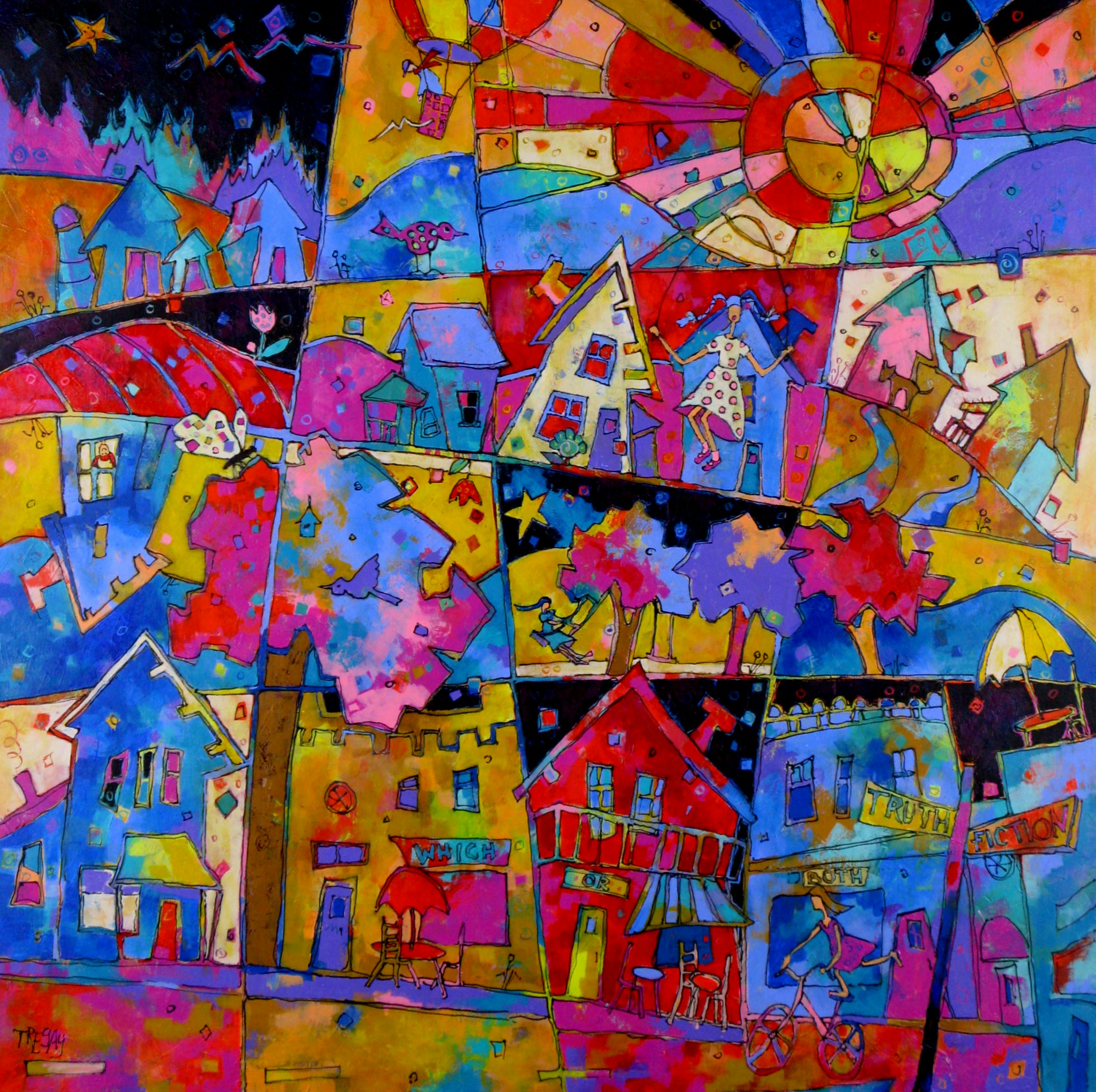 Caption on edge of canvas: "Truth, Fiction and White Lies"