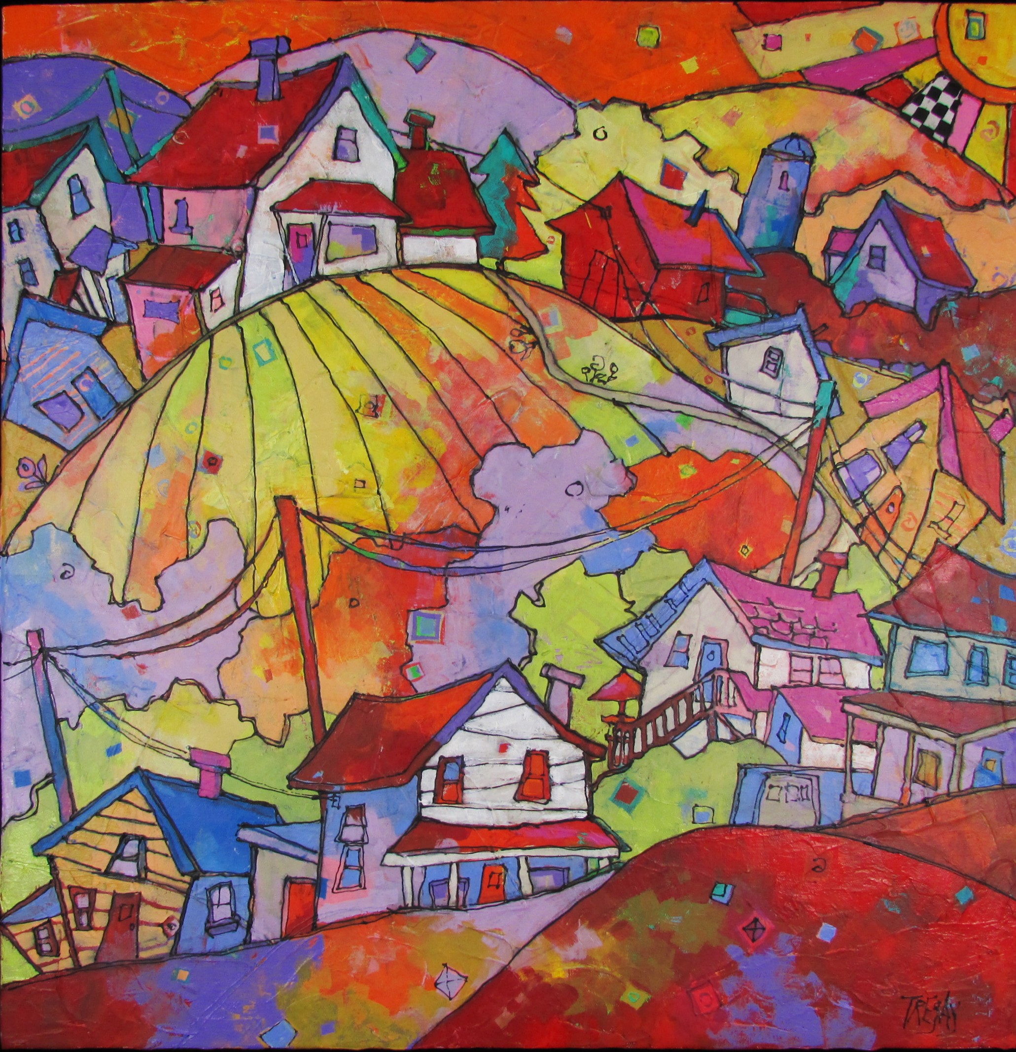 caption on left edge of painting, "Walking Forward, Looking Back"
